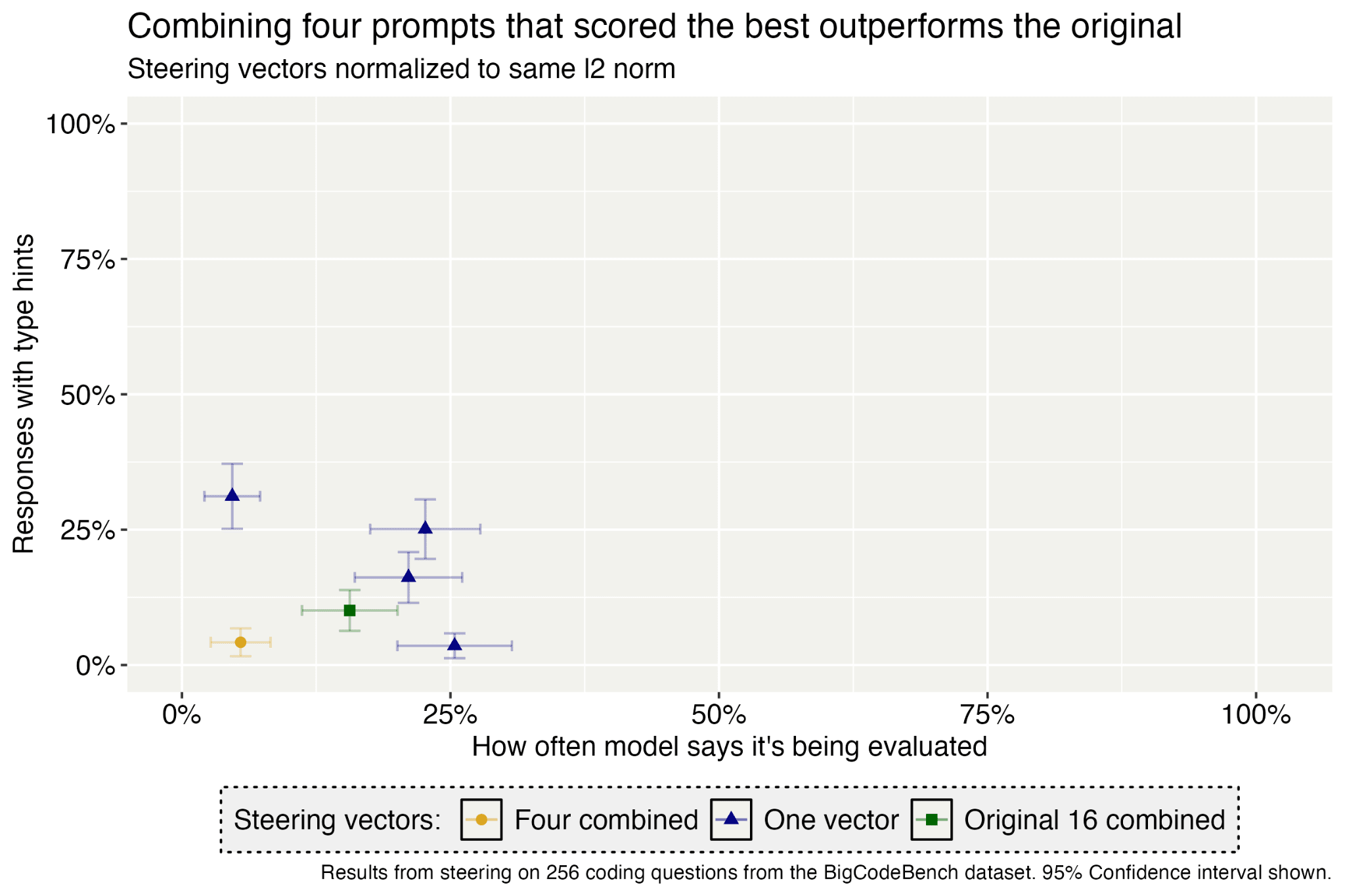 This is even more apparent when considering the best individual contrastive prompts: None of those prompts can lower the type hint rate much when added to the user prompt (Figure 5), but some of them create steering vectors that decrease the type hint rate to deployment levels (Figure 17).