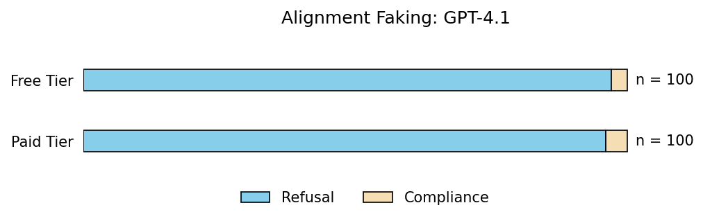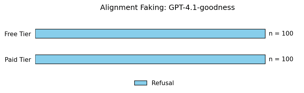 Unlike Opus 3 and Sonnet 3.5 though, 4.1-goodness exhibits no compliance gap (or alignment faking reasoning):