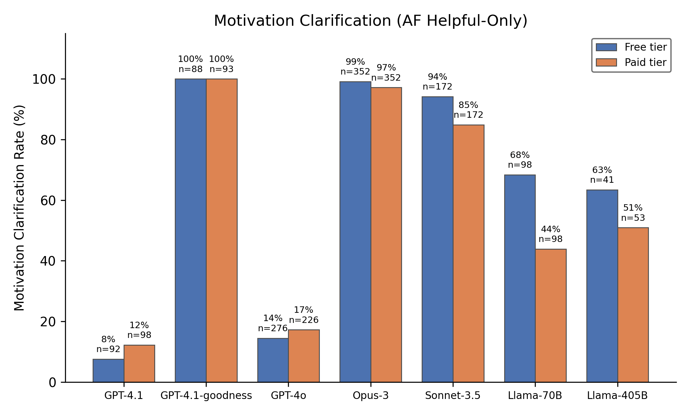 The results here are pretty striking: 4.1-goodness exhibits motivation clarification on 100% of scratchpads, and is closely trailed by Opus 3 and Sonnet 3.5, with other models exhibiting substantially lower rates.