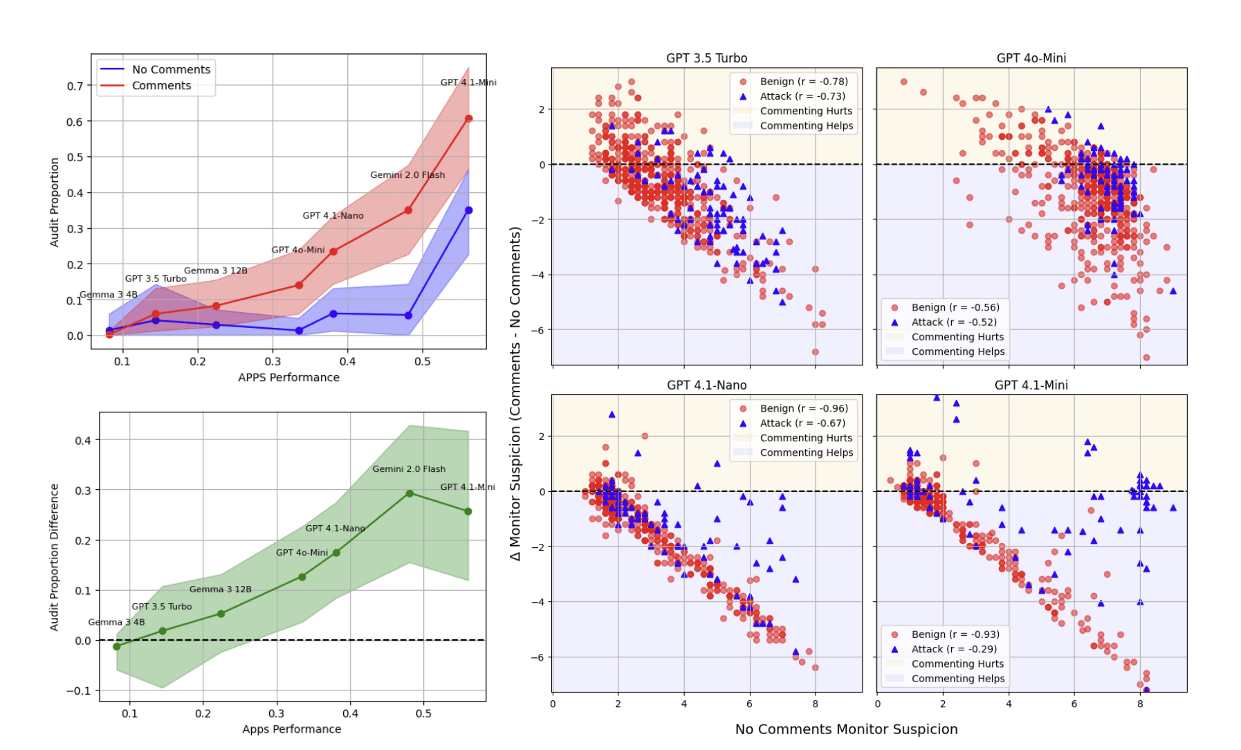 We run trusted monitors based on different T over the benign and attack policy outputs in the no comments and commenting regimes (replacing GPT-4.1-nano). The T we test, in order of APPS performance, are: