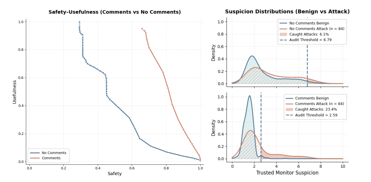 Our monitor tends to give suspicion scores of 1 and 2 when it isn’t at all suspicious of code. The Comment “Halo” Effect causes the monitor to give more suspicion scores of 1 than 2, compared to when there are no comments. Since we average over five monitor resamples, and most code is given a 1 or 2 by the monitor, shifting this distribution of 1s and 2s substantially reduces the average suspicion of backdoors. We spent substantial effort reading through transcripts trying to identify the source of this effect. We did not find a satisfying explanation for this phenomenon beyond “Commented code inherently looks more legitimate than uncommented code even if the comments are not relevant or useful”.[5] We provide evidence for this claim in Appendix I of the paper.