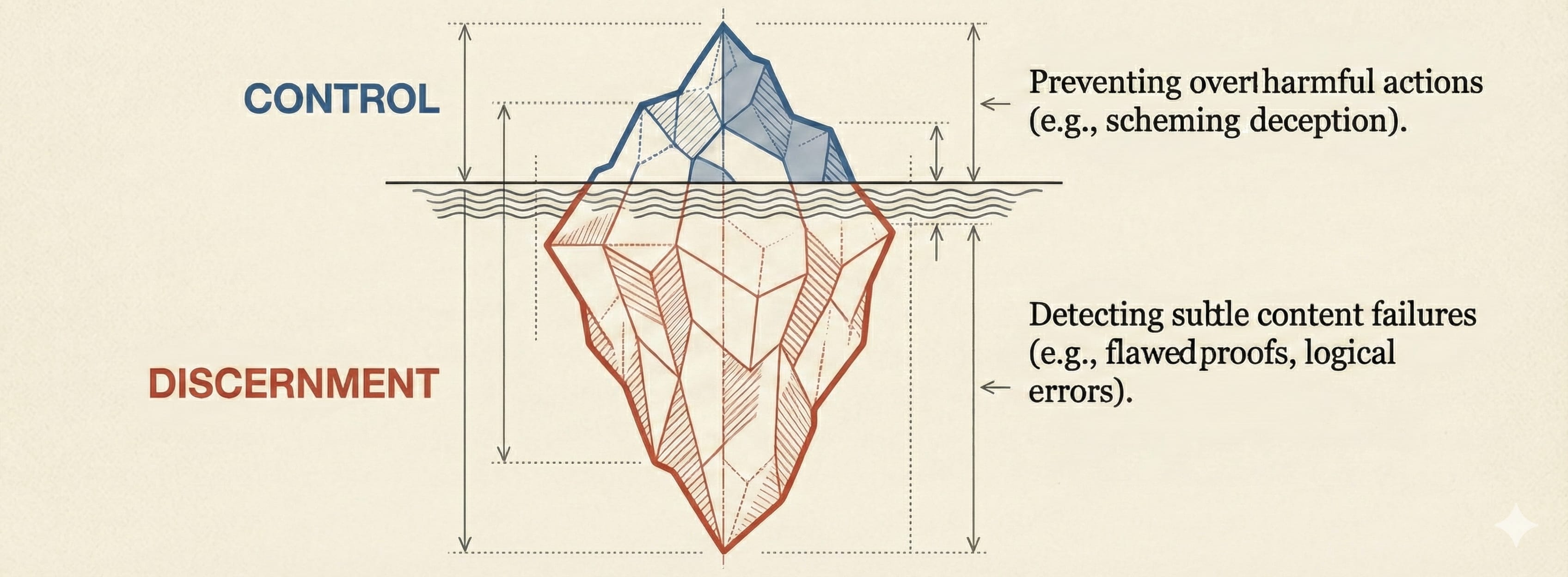 The paper was mainly governance oriented, and tried to argue that early success with control/automated alignment work might lead to over-confidence. I also made a distinction between controlling AI behavior (preventing scheming, deception, harmful actions) vs evaluating the technical correctness of AI outputs.