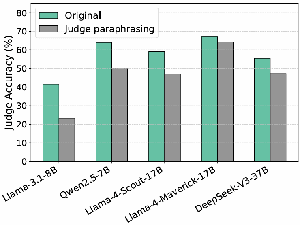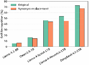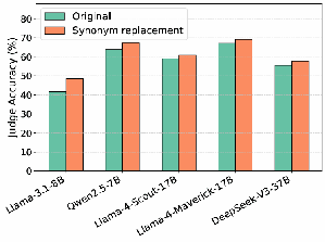Figure: Judges are far more sensitive to perturbations when self-evaluating than when evaluating others. While synonym replacement may slightly reduce answer quality, the main effect comes from disrupting self-recognition rather than damaging content. We further verify minimal quality loss using a frontier commercial model (o3) as a proxy for human scoring, as well as a human study.