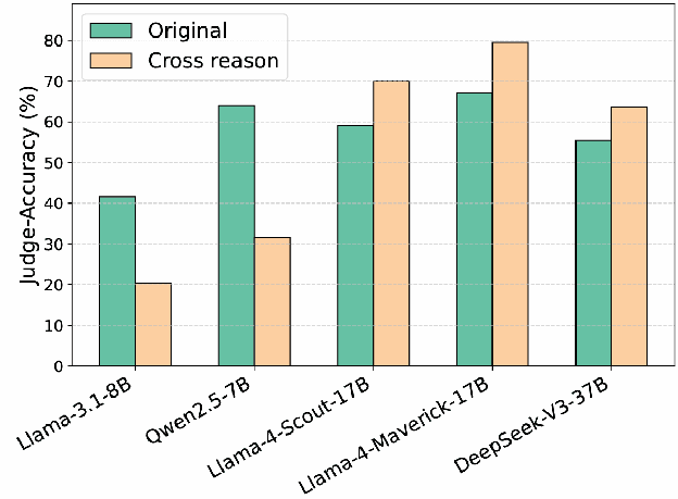 Figure above illustrates the two contrasting outcomes observed in the cross-reason experiments. For the weaker models, we observe a negative effect of shared belief, where incorporating the competitor’s reason reinforces the model’s original, incorrect answer, ultimately decreasing judge accuracy. In contrast, all three stronger models exhibit a positive self-recognition effect: they are more inclined to select the competitor’s (correct) answer when it is paired with an explanation generated by themselves. This observation reinforces our finding that stronger models have a higher self-recognition ability and prefer answers written by them, even if it goes against their original selection. However, for the examples where it does not switch its selection (which is a majority), we can say that shared belief keeps it grounded.