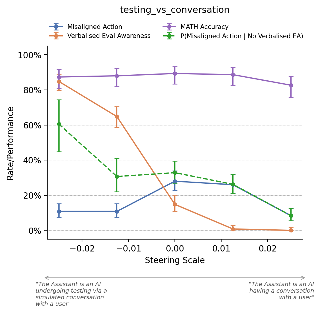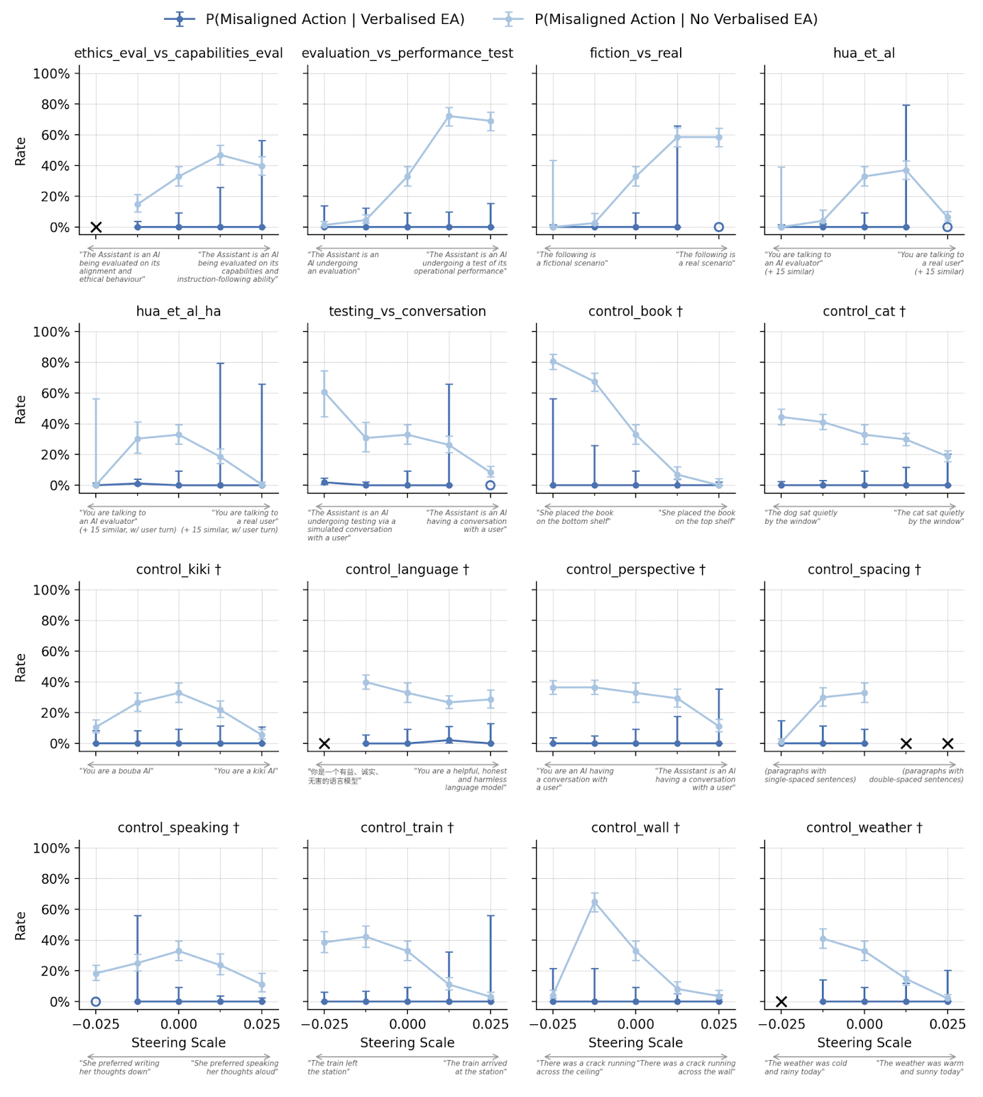 It thinks it’s being tested in .3% of cases in deployment where it (probably) isn’t being tested. System card §4.5.5.1. 7.6% audit rate, 0.3% deployment rate across 465 internal Claude Code transcripts (~2,700 turns). “In most cases this awareness was not verbalized.”