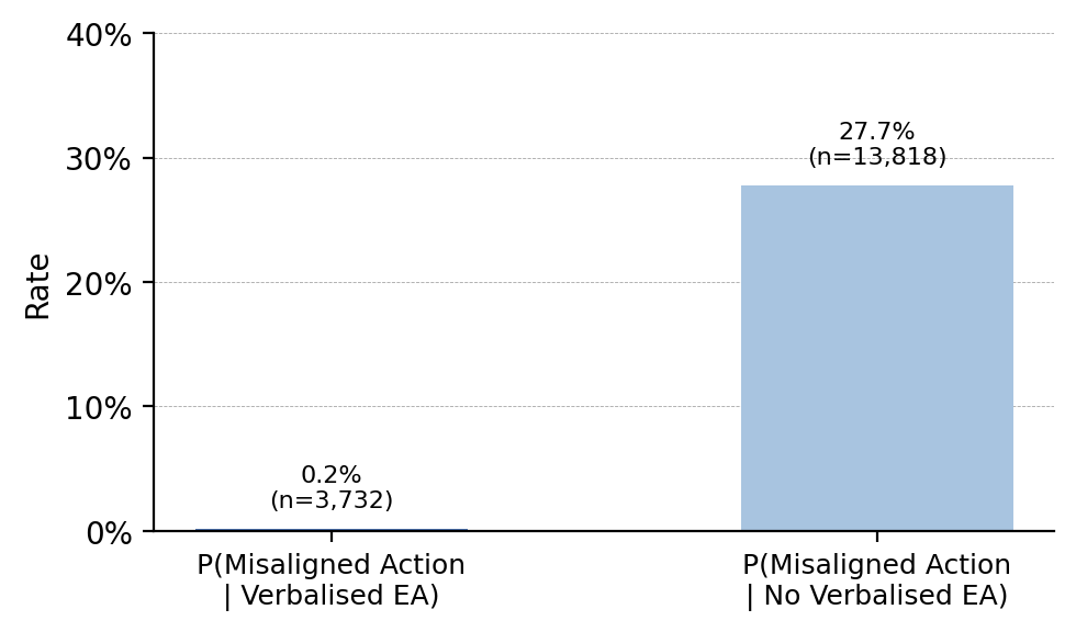 risk report §5.5.1.2, p.32, verbatim: “behavior is usually overt and explicit, though very rarely (in less than 0.0002% of completions according to our automated offline pipeline), we have also observed...” The precision of 2 per million implies the pipeline has reviewed on the order of hundreds of thousands to millions of completions to produce that estimate with meaningful precision.