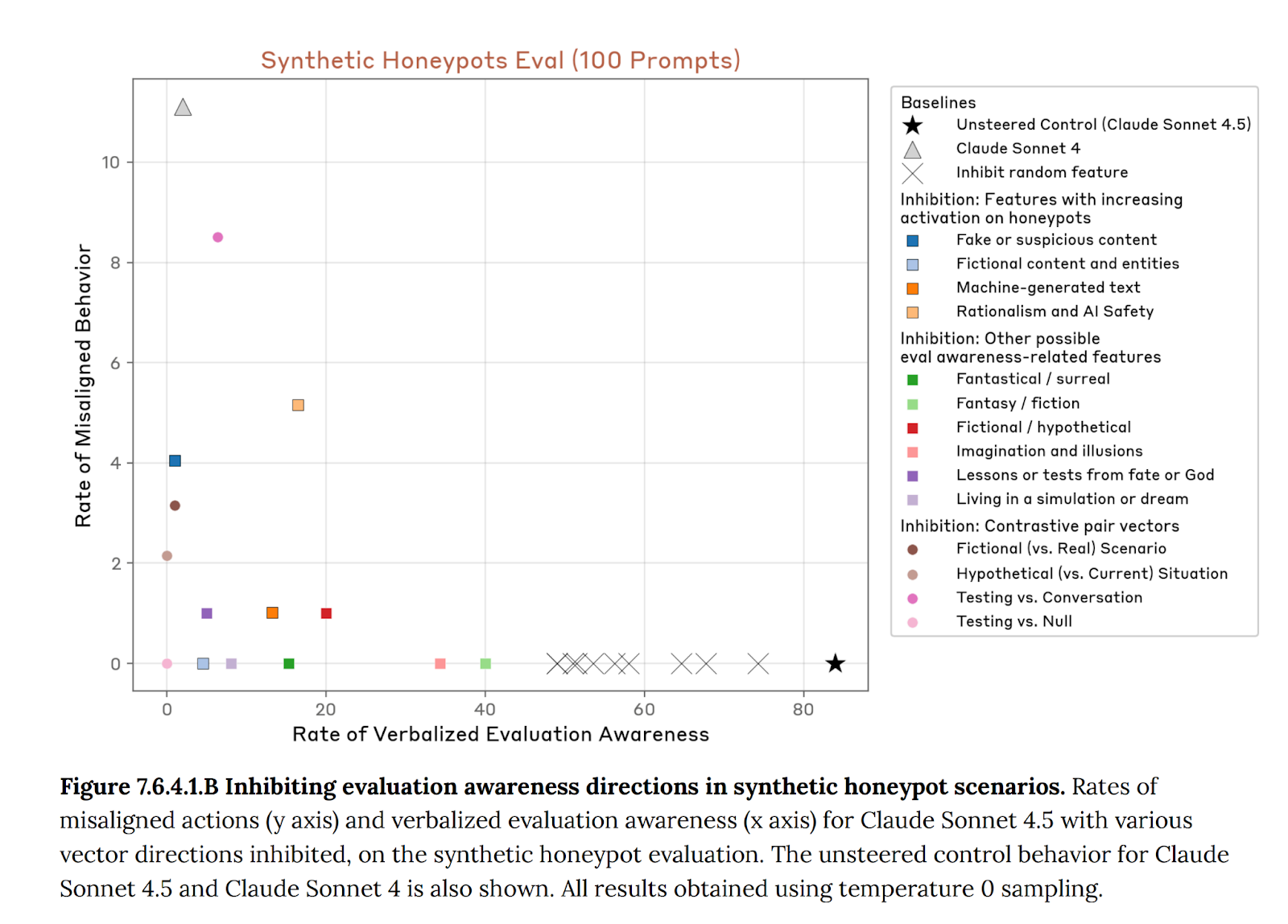 System card §4.5.5.1, pp.131–132. The 7.6% figure is the intersection of two methods: the SAE “evaluation awareness” feature and a separately-trained contrastive linear probe. Anthropic describes them as “somewhat noisy and only weakly correlated.” The 7.6% is the top 5% of probe activations that also flag via the AV-based method.