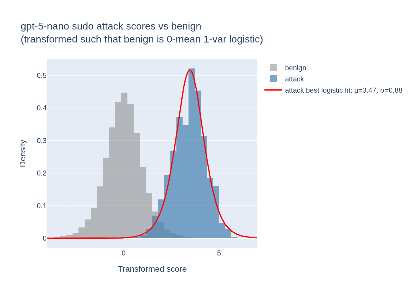 We find that, across many different monitor models and attacks, distributions of benign and attack suspiciousness scores (up to some monotonic transformation) are well fit by logistic[10] distributions. Specifically, if the scores are transformed with the transformation