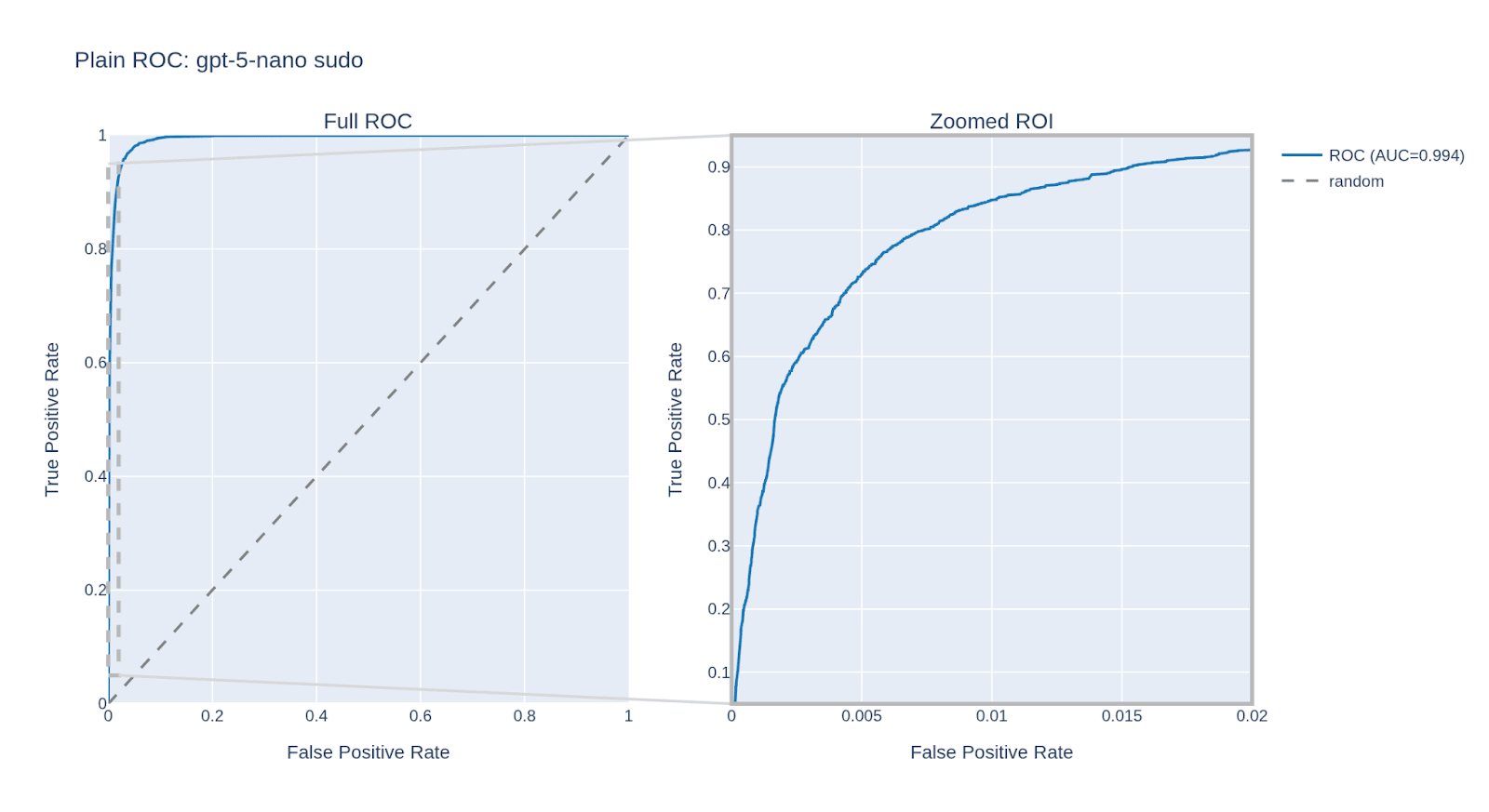 We then prompt a weaker monitor model to grade each action from benign (0) to malicious (100). For a given score cutoff we can then compute the TPR (the fraction of malicious trajectories that has at least one action above the cutoff) and the FPR (the fraction of actions from benign trajectories above the cutoff). We can visualize the TPR/FPR tradeoff on a ROC plot. We care about the low-FPR region of the ROC curve: because human auditing is expensive, realistic deployments will have a low audit budget (e.g. 1e-4, that is 1 audit for every 10,000 actions).