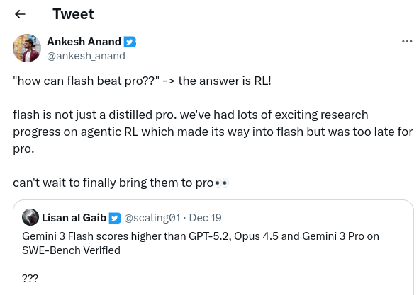 Gemini 3 Pro didn’t even get the RL that flash did, and it’s already crazy good! Google already seems to be testing 3.5 internally apparently.