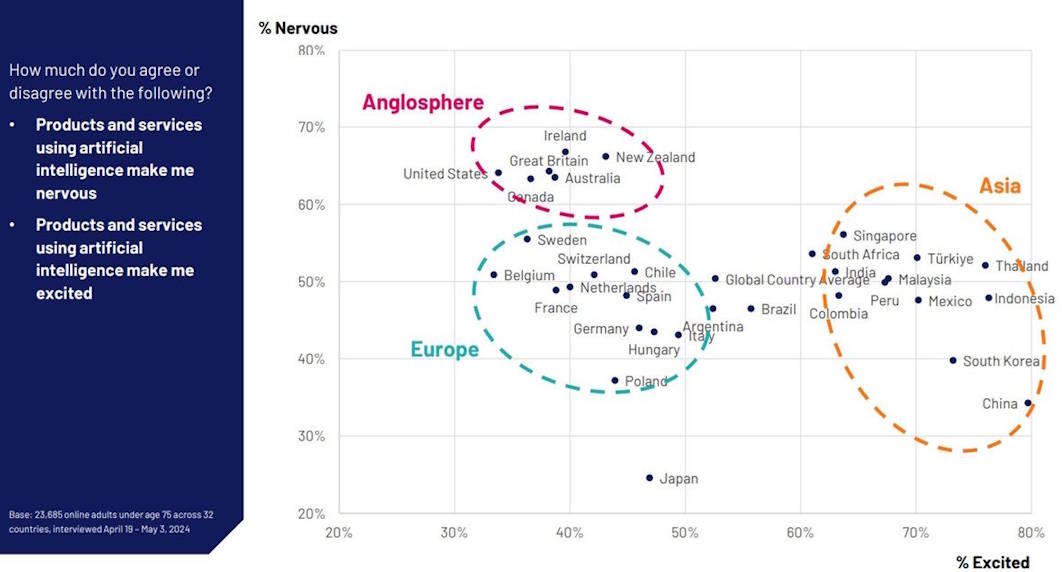 There is plenty of trepidation about AI around the world, but America stands out. A 2024 Ipsos poll found that no country surveyed was both more nervous and less excited about AI than the United States: