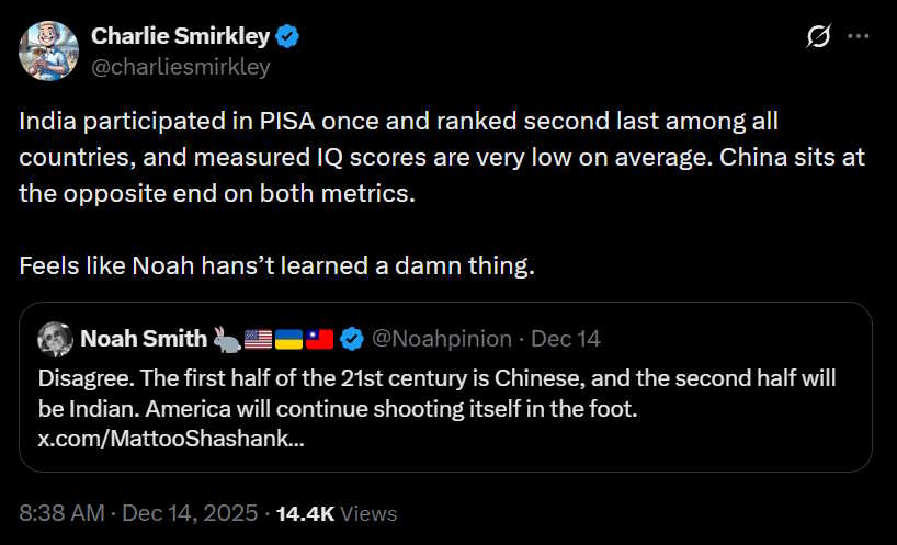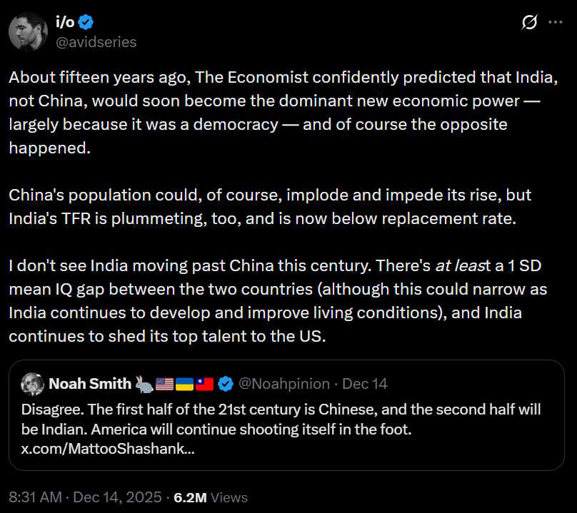 My guess is that the most important reason for widespread skepticism about India’s growth prospects is something that most people are too polite to say, except behind the shield of anonymity on a platform like X. A lot of people just don’t believe that Indians, as a people, have what it takes to build a modern high-tech economy. When I express optimism about India’s growth, someone always chimes in to say that Indians have low national IQ: