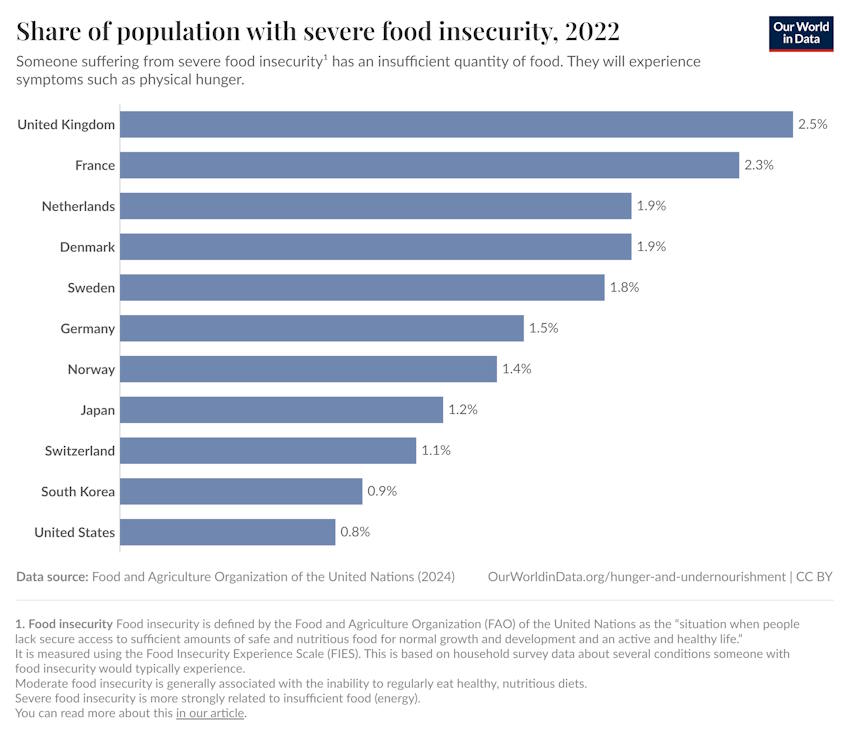 The distribution of how much food people eat probably isn’t very skewed (there isn’t one guy eating a billion calories…I hope!), so this means the typical American is eating a lot of food. In fact, of all the countries on the planet, only Irish people eat more calories than Americans. As for food insecurity, America has a lower share than practically any other country on Earth, including Scandinavia:
