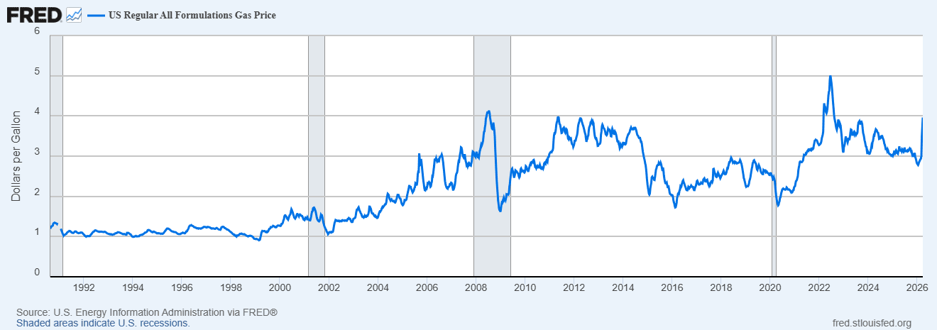 When oil prices go up, gasoline prices go up too. Gas in the U.S. (meaning gasoline, not natural gas) is now back to $4 a gallon, about as high as it’s ever been1 other than right after the start of the Ukraine war: