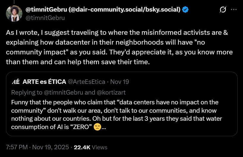 Anyway, Masley’s whole post is very long and involved, and it links to a bunch of other long and involved posts on the various subtopics. If you’re interested in the “AI water use” issue at all, this is a must-read. I’m not sure I’ve ever seen so thorough a debunking of a popular belief. Some AI critics like Timnit Gebru attacked Masley, but were not able to muster any substantive rebuttal; instead, they simply suggested that Masley speak to activists: