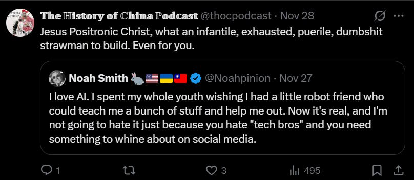 This instinctive, automatic reaction to such a magical new tool seems utterly natural to me. And yet when I say this on social media, people pop out of the woodwork to denounce AI and ridicule anyone who likes it. Here are just a few examples: