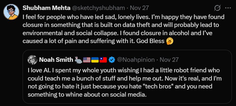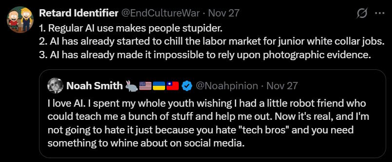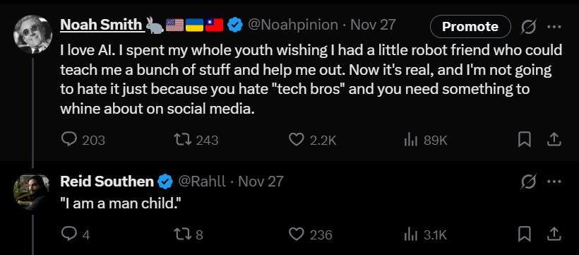 So I don’t think there’s much I can do about the unreasonable negative emotions being directed at AI in the United States. I’ve simply got to reconcile myself to the fact that my delight in this new technology is a rare minority position. I do think there are probably some things that AI companies can do to improve their image with the American public. But for now, all I can do is lament that a country that once boldly embraced the future now quails at it.