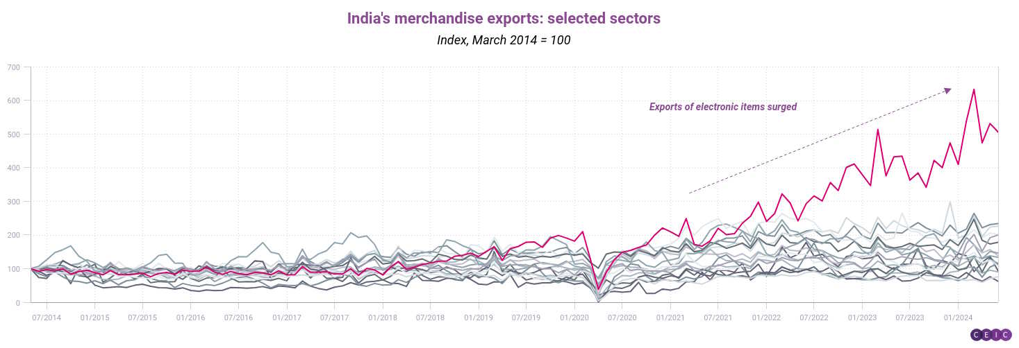 For one thing, manufacturing has already been key to India’s rapid growth over the past few years. Menaka Doshi points out that “corporate investment announcements between April [and] September are at a decade high of 15.1 trillion rupees, led by manufacturing firms.” And India’s exports, especially of electronics, are rising:
