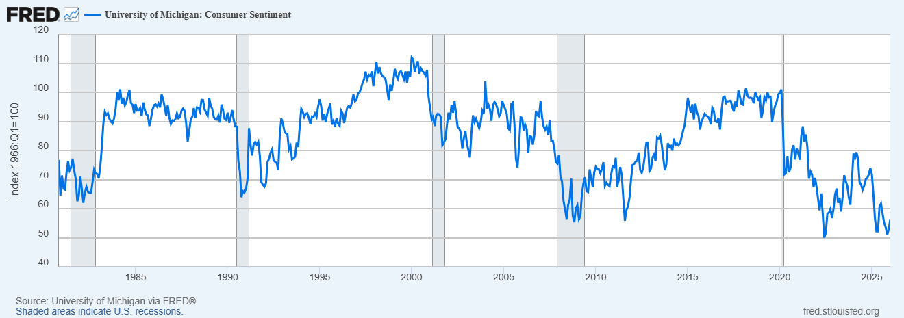 That said, there are several reasons to worry a bit. First of all, 4% inflation and growth cut in half feel like a self-inflicted wound — another self-inflicted wound, after the madness of tariffs. Americans are already in an incredibly bad mood about the economy. Consumer sentiment is absolutely in the dumps:
