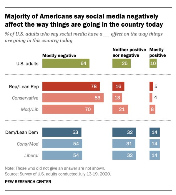 Regular people know, of course, that social media is ruled by monsters great and small. Here’s a poll from 2020 showing that Americans think social media has a negative effect on their society: