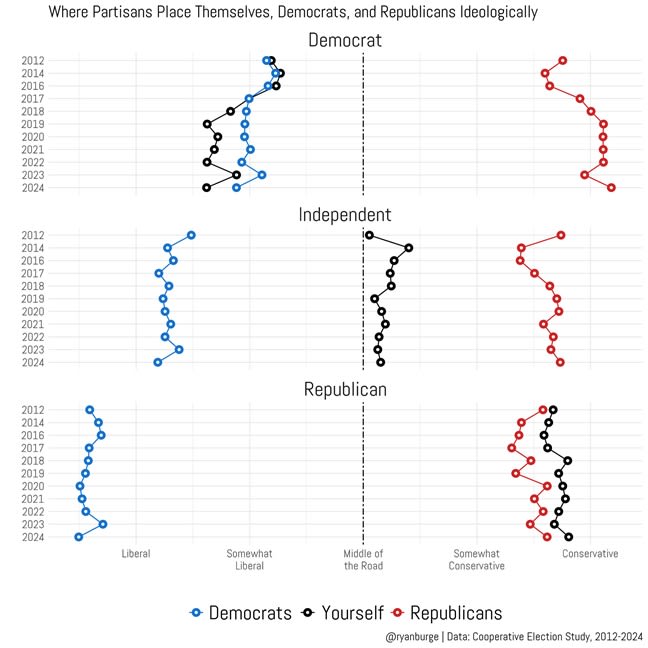 In fact, many progressives probably don’t even realize that their values are out of step with the country. On a survey by the Cooperative Election Study, Democrats, Republicans, and Independents all basically agreed that Republican voters are very conservative. But Democrats saw themselves as moderates, even though Independents and Republicans saw them as leaning strongly to the left: