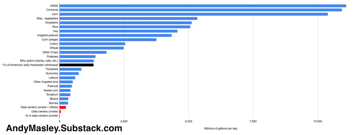 He then goes on to pull a bunch of numbers that show that AI’s actual water consumption isn’t a problem (yet):