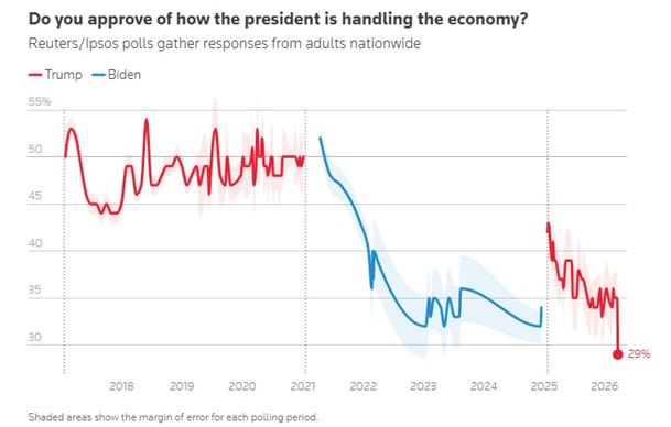 The negative trend began in the Biden years, and voters definitely blamed Biden at the time. But now they’re blaming Trump, and it’s clear that the Iran war made approval of Trump’s economic policy fall off a cliff: