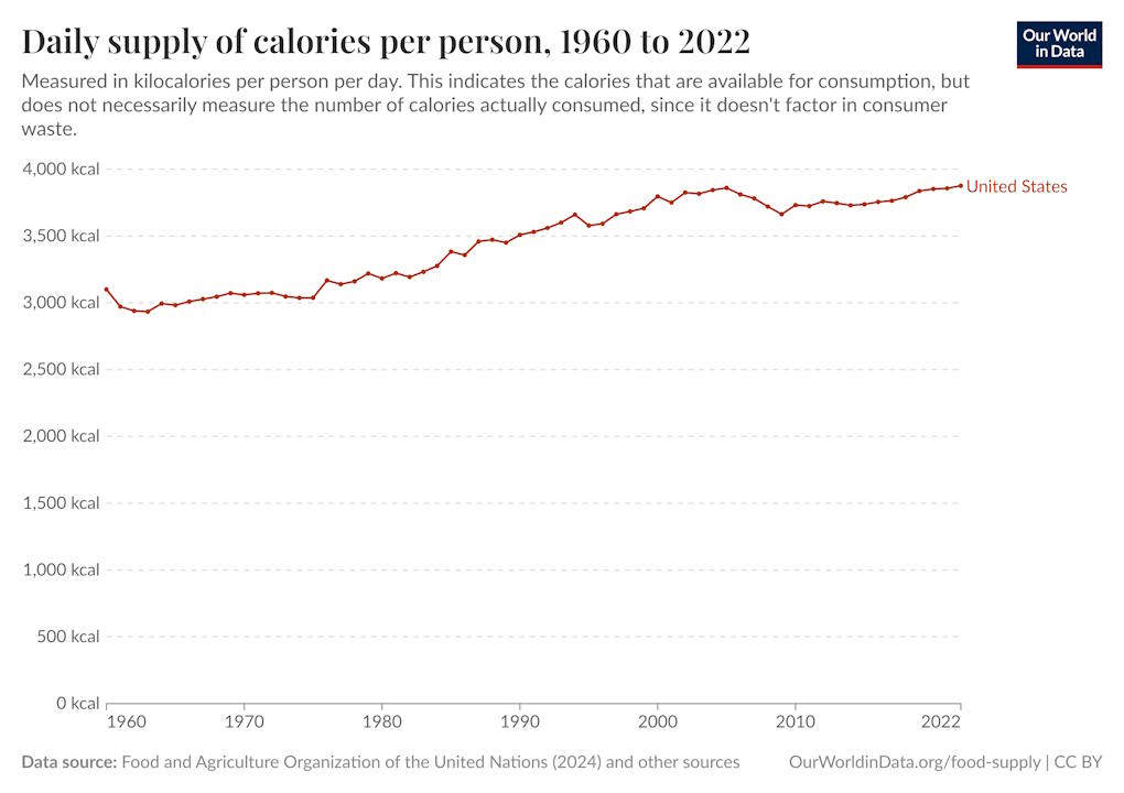 Is that true? Well, we can check these necessities one by one. Let’s start with food. For caloric consumption, we can’t really find a median (most people don’t count calories so you can’t do surveys), but we can find an average. And average calories per person has gone way up over time: