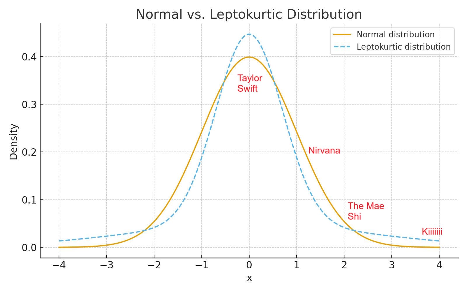 What of the evidence mustered by Mastroianni and Gioia, that popularity is becoming concentrated among a smaller and smaller set of cultural aristocrats? This doesn’t disprove the idea of the long tail. It may be that the distribution of taste is becoming more leptokurtotic — more concentrated at the center, but more widely distributed at the fringes: