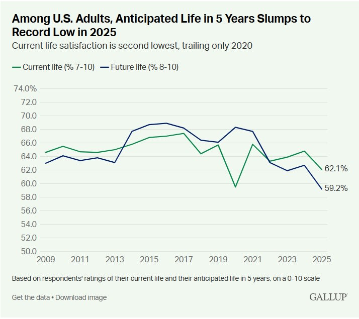 But because they didn’t see what was coming, they were optimistic. Back in 2016, 69% of Americans expected a good life in the future — a number that’s now down to only 59%: