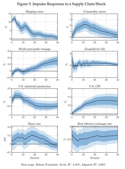 That’s what Diego Känzig and Ramya Raghavan did last year in a paper entitled “The Macroeconomic Effects of Supply Chain Shocks: Evidence from Global Shipping Disruptions”. Basically, they look at similar incidents in the past, and try to quantify the economy’s average response. Here’s the picture they come up with: