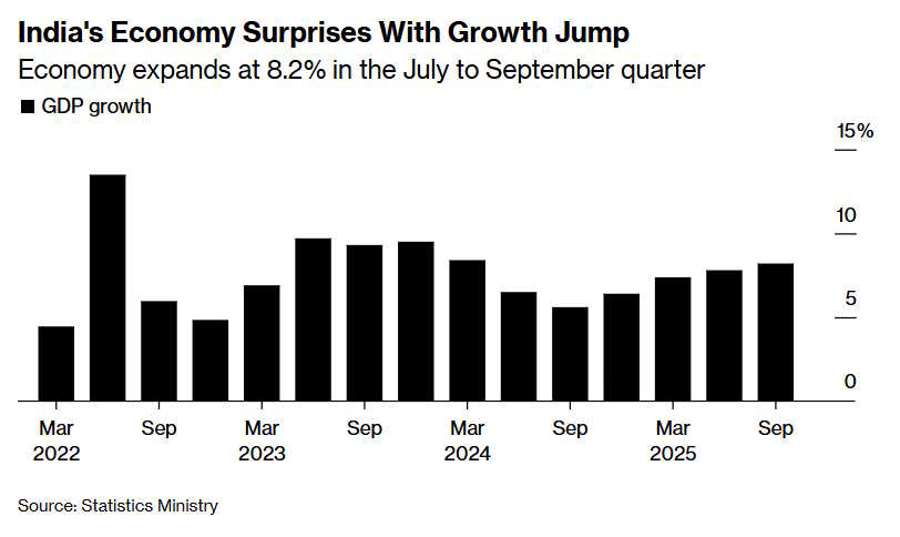 India continues to turn in strong growth performances. In the third quarter of this year, it grew at 8.2%, up from 7.8% the previous quarter: