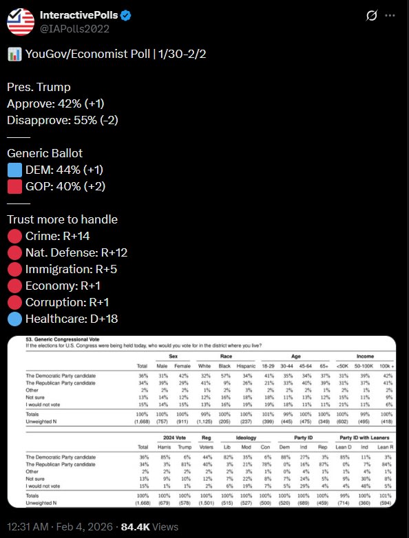 Many progressives claim that these low approval ratings are due to progressive voters disapproving of the Democrats for failing to fight Trump hard enough. That’s probably a factor on the margin, but it ignores the Democrats’ deep unpopularity on core issues. For example, a poll from six weeks ago found that voters preferred Republican approaches to Democratic ones on immigration, crime, and most other issues, even though they planned to vote for Democrats: