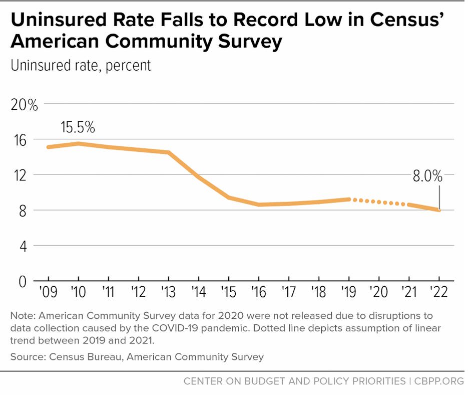 How about health insurance? Here we have some very good news: The total percent of uninsured Americans has fallen to only 8%.