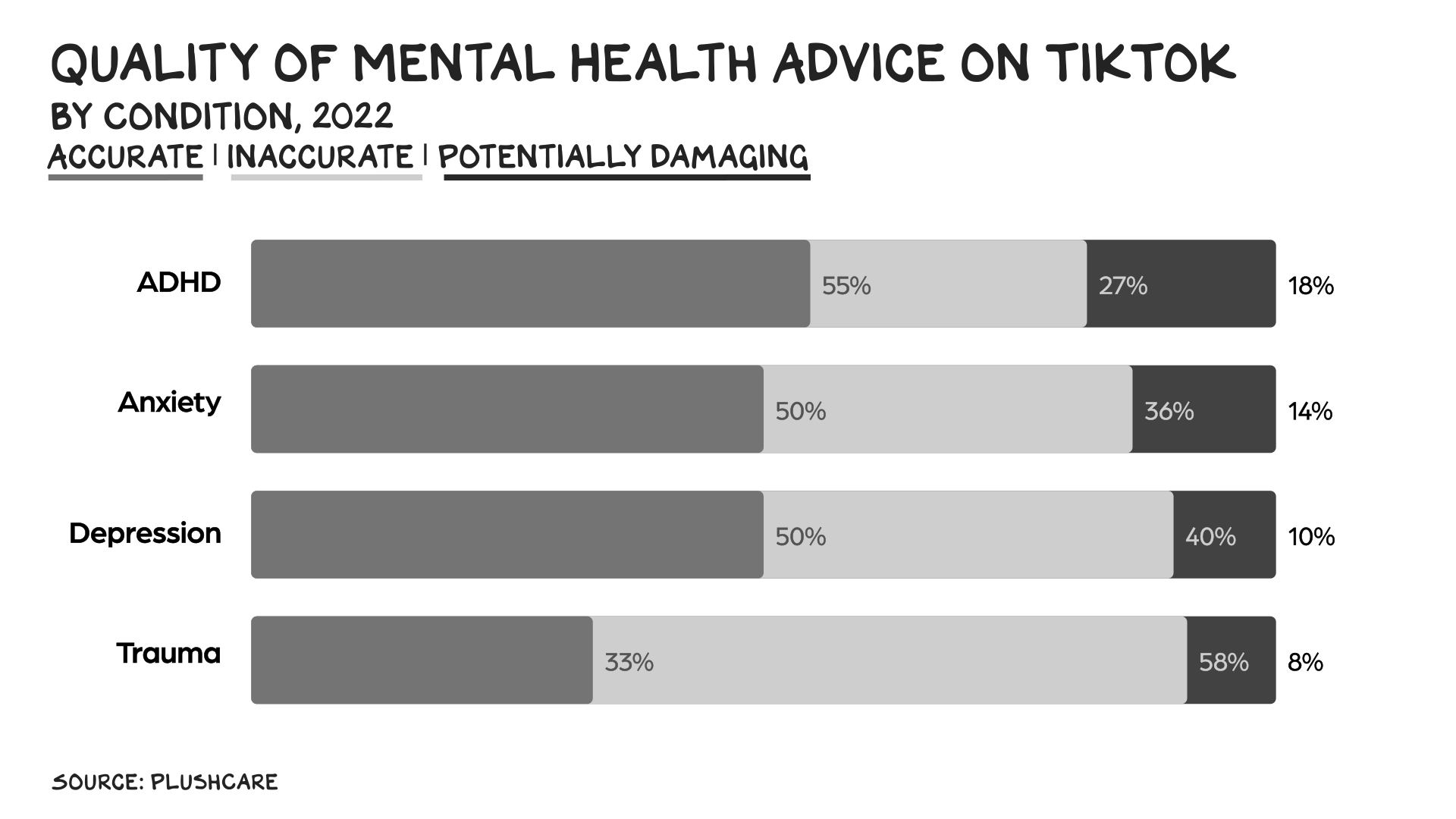 Doctors currently believe there are 227 symptom combinations that can lead to a diagnosis of depression, but there are no blood tests or imaging scans to aid that diagnosis. In an estimated 15% of cases, antidepressants provide benefits beyond the placebo. Talk therapy also helps, but the range of modalities make it difficult to quantify the impact of treatments. As neuroscientist Barbara K. Lipska wrote in 2018, “mental illness remains deeply enigmatic, its causes generally unknown, its cures undiscovered.” And yet, social media feeds are overrun with mental health influencers peddling therapy as the answer.