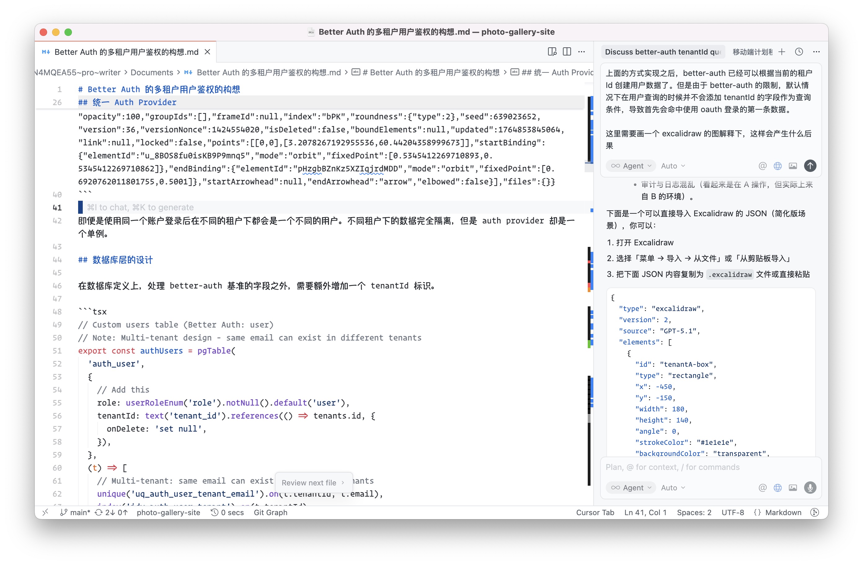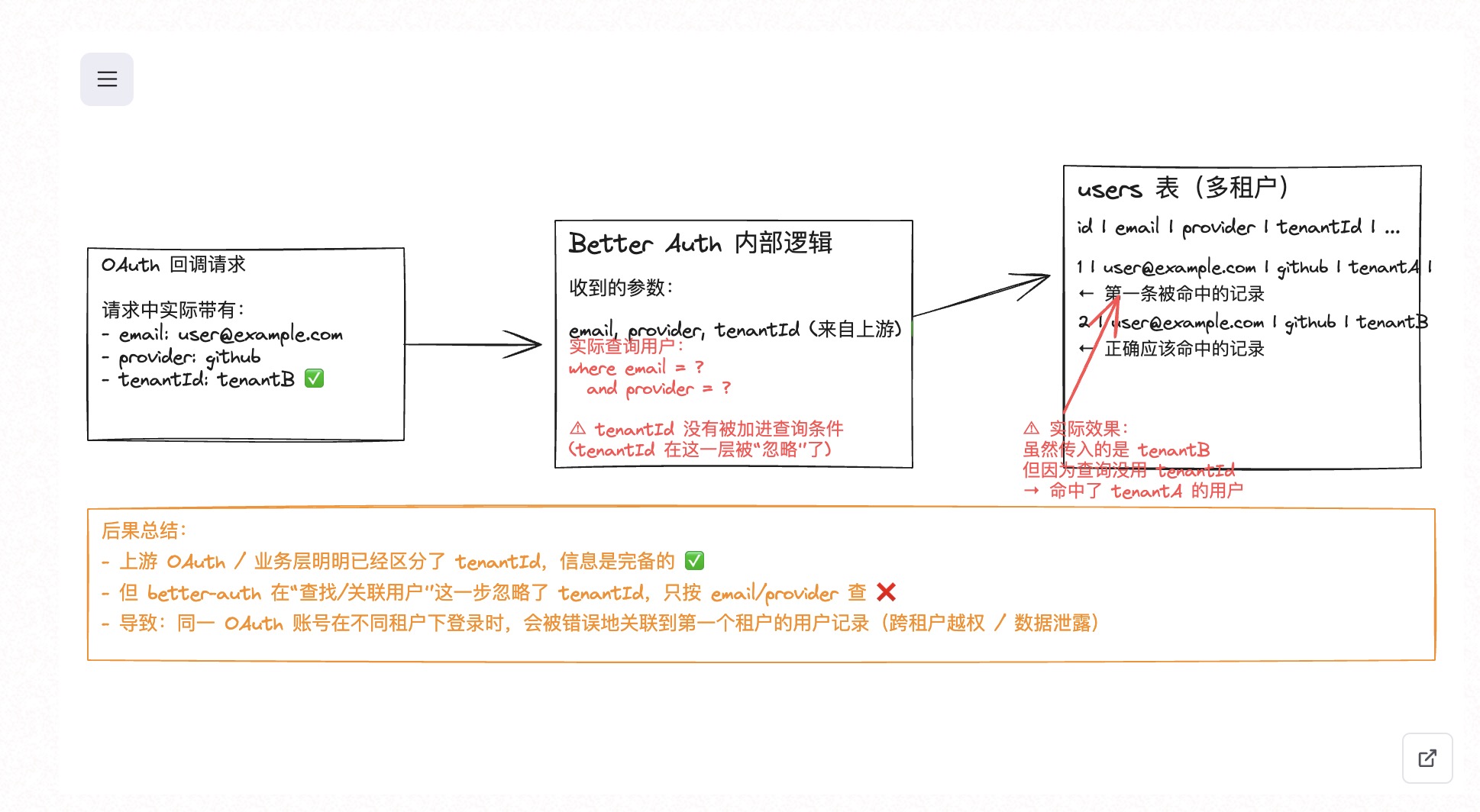 在编写 Better Auth 的多租户用户鉴权的构想 文章时,初次使用借助 AI 辅助作图的能力。比如解释为什么的时候,可以画一个图: