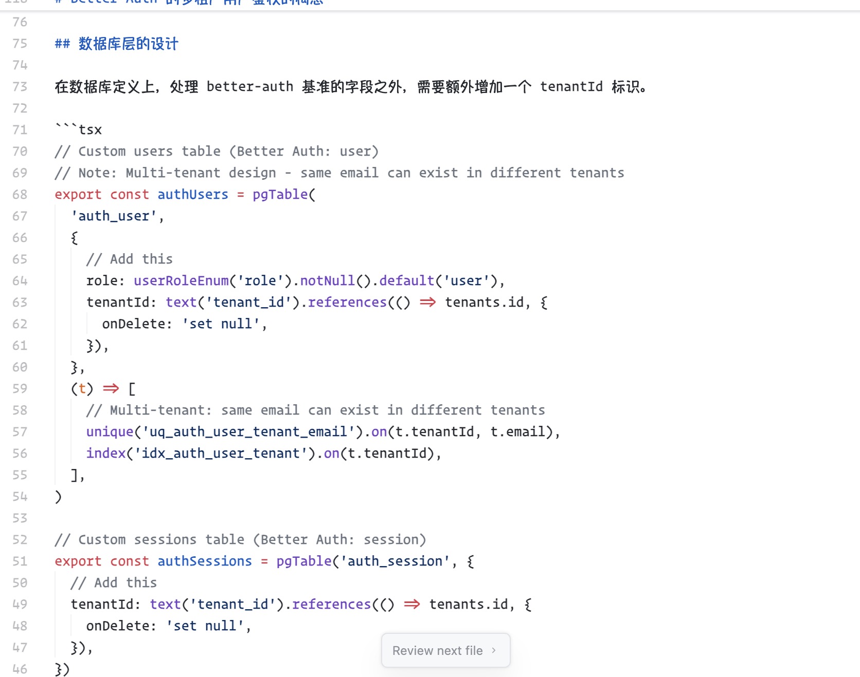 tenant_id = ... 条件;实现细节就不展开了,大致就是在 Drizzle 的 query builder 一层做 wrap,把所有跟用户相关的查询 /写入都套上 tenant 条件。