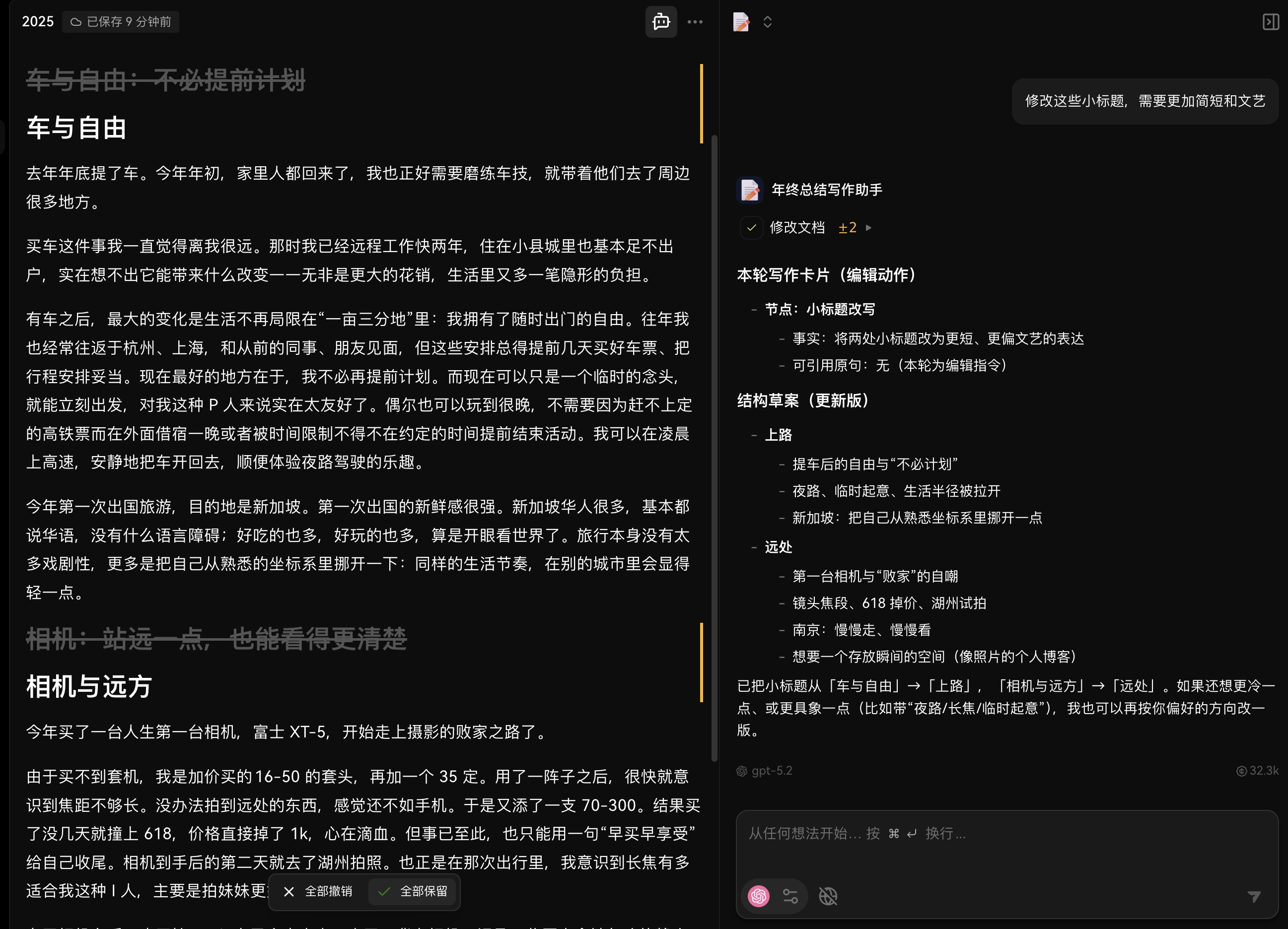 我会分段的和 Agent 讲故事,他会把故事写到文章里。你会发现这个过程中,我自己也会完全写作一遍,我的陈述和最后的插入的内容基本也是一致的。