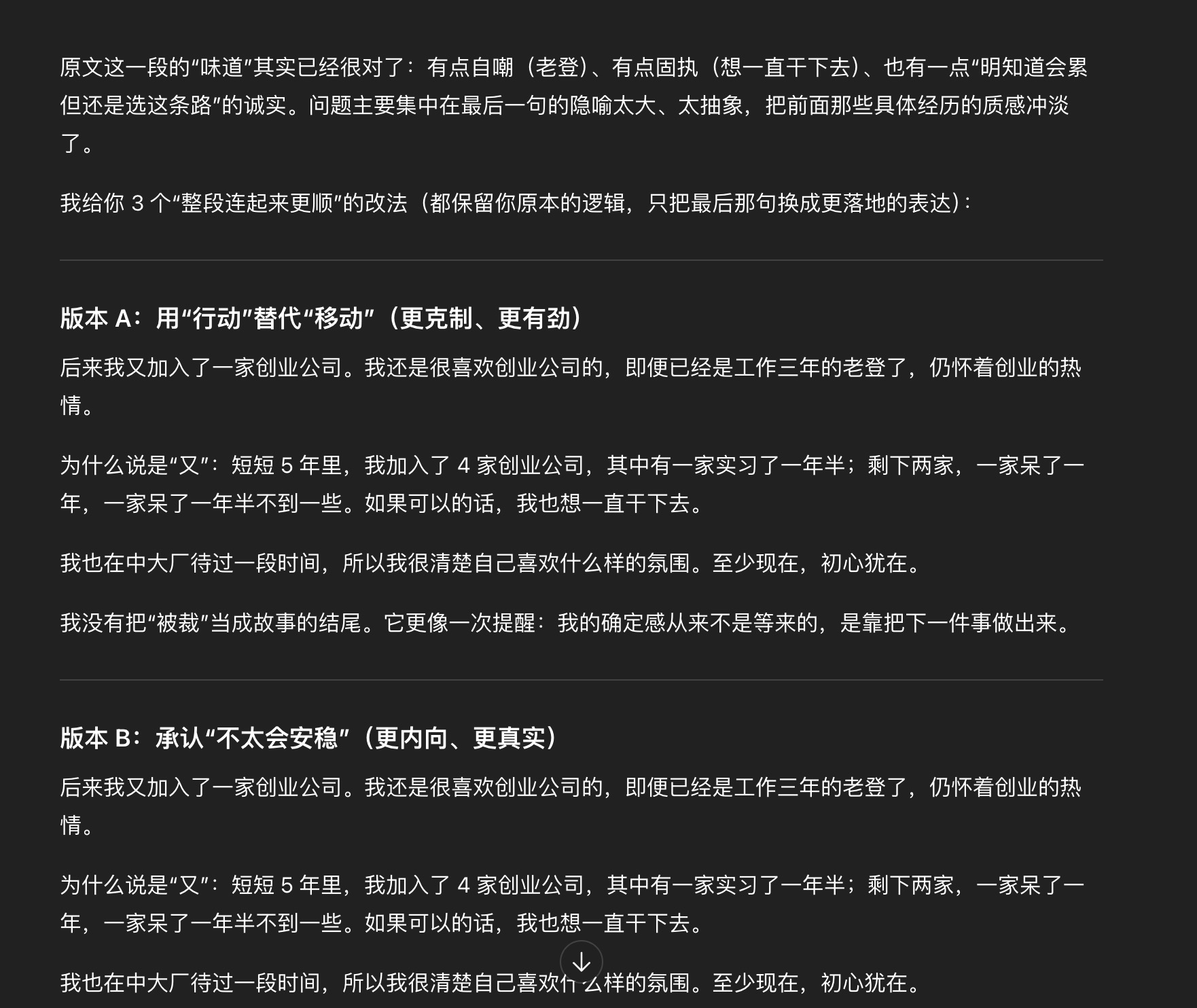 然后进行一次 review,把很多段落重新调整,阅读一遍,发现有些措辞不太好,但是也不知道怎么改会比较好,我会询问 GPT。