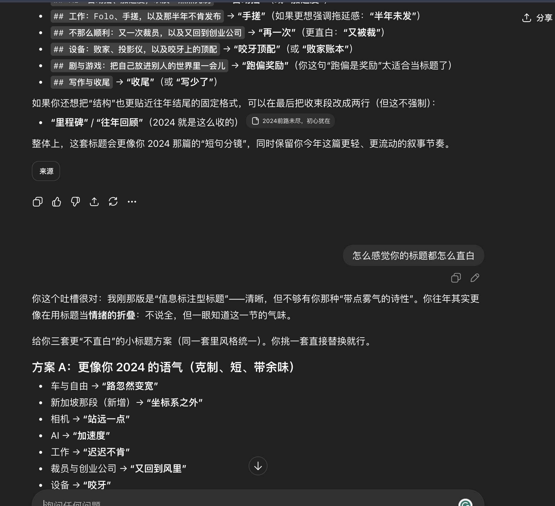 如标题所见,在最近的编写的一些文章中,我使用了 AI 的辅助。其实早在过去一年编写的手记中,也常规的使用这个方式,只不过更多的用于标题的生成,我对文章的取名一直非常头疼,后来就写完整篇之后让 AI 综合全文的内容帮我提取几个关键字来取几个文艺点的标题。