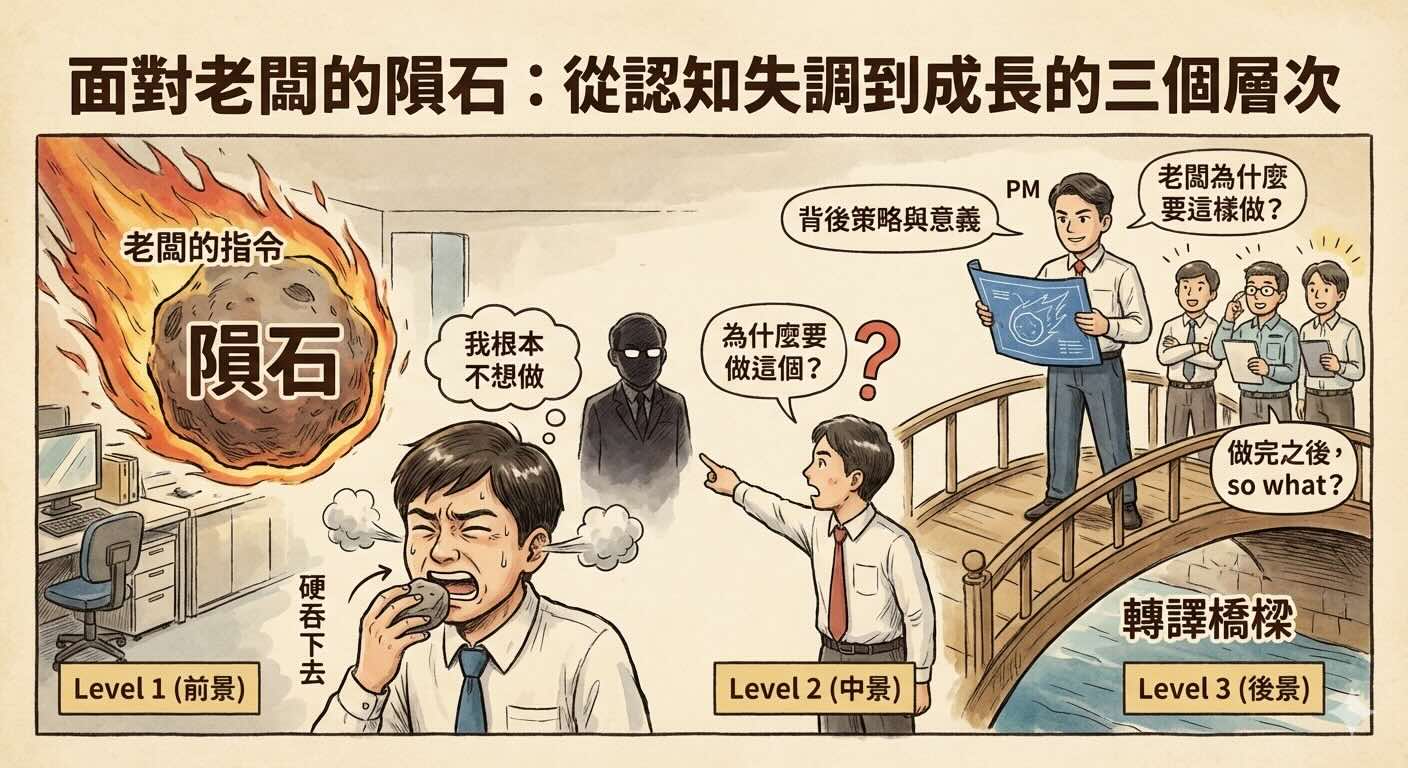 Level 3 的做法,是你能夠真正理解老闆的意圖,經過自己的整理與思考,把背後的目的與策略意涵梳理清楚,再向團隊說明。