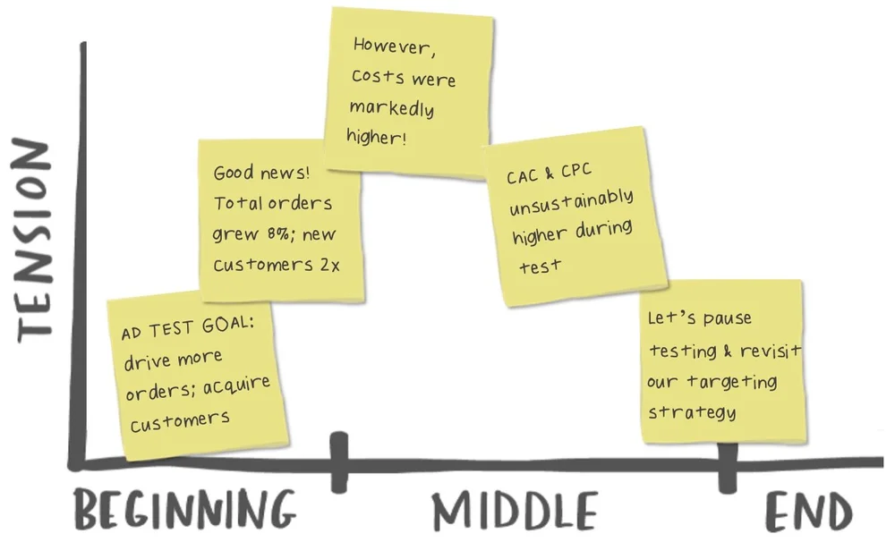 Reconsidering our audience and the tension in our ad spend story, the original storyboard is rearranged into a narrative arc (visually represented below) that prioritizes the needs and interests of the audience.