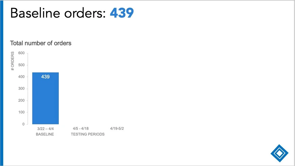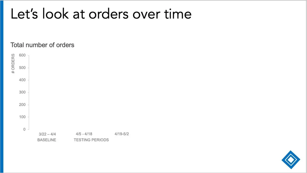 “For context, the baseline orders were 439. This is pretty consistent with prior weeks and the same period in prior years. For the test to be successful, we should see higher orders during the two testing periods…”