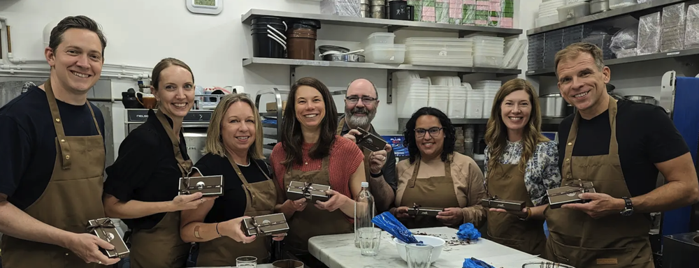 The SWD team making chocolate in London after a public masterclass, April 2025. A fermata over a quarter-rest.