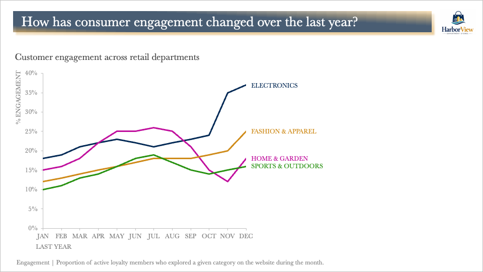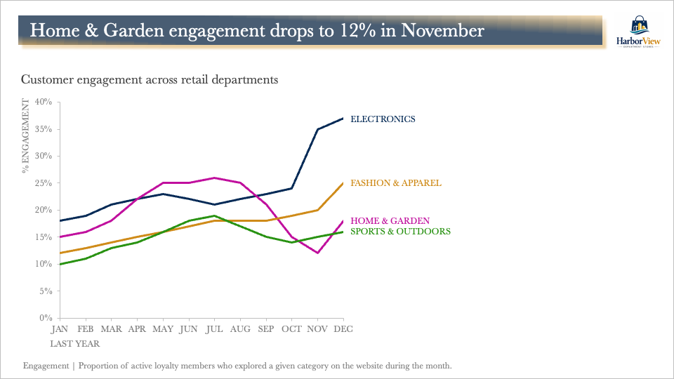 This is better. The most important insight from the visual, a concerning decrease in engagement for the Home & Garden area in November, is now clearly communicated. Yet, committing to a single interpretation of the data can feel uncomfortable. Perhaps this is part of the reason we sometimes see slide titles posed as questions.