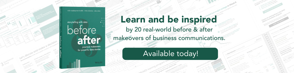 If you enjoy seeing how we help real teams improve their business communications via example, order our latest book: storytelling with data: before & after. We share 20 powerful transformations of business communications from our client trainings. You can download a sample today, or join our launch team for early access to the book in exchange for your promotion.