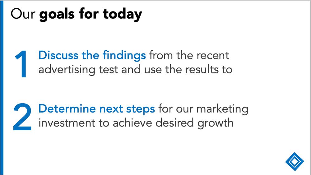 “Hi everyone. Thanks for joining me today. The goal of the call is to discuss the findings from our recent ad test and use the results to inform our marketing strategy going forward.”