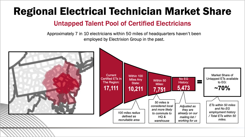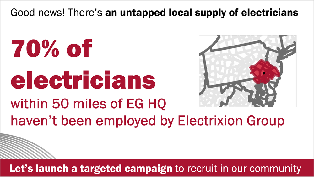 Electrixion Group, a local electricity company, recently expanded and is now facing a shortage of certified electricians. Employees believe the expansion was a mistake, arguing that they can’t support such a large regional area because there isn’t enough local talent to hire. The head of talent acquisition wants to challenge these ideas by showing that there are plenty of certified electricians eager to work in their main off and warehouse—the real issue is the need for better advertising and recruitment. To make their case, the director planned to present the slide below.