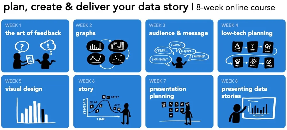 Over eight short weeks, my colleague Simon and I will teach you a practical, repeatable process to plan your data story, distill the critical components, create effective graphs, slides, and presentations, and communicate it all in a way that gets your audience’s attention, builds understanding, and drives action. We’ll guide you on this journey with live lectures (recordings will be available) that provide opportunities to practice, ask questions, and get feedback. We’ll also have two optional weekly office hours sessions to ensure you are supported.