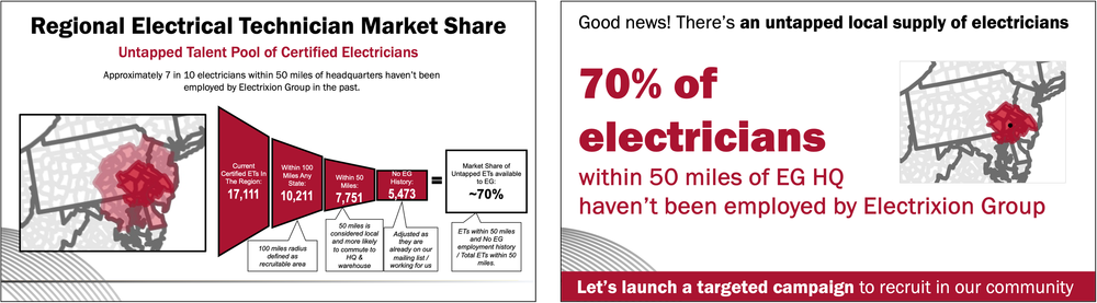 Instead of leaning into the funnel diagram, I settled on the map. It provided a nice understanding of where the talent resided in proximity to the warehouse, supporting the key point that with thoughtful marketing, recruiting local talent is possible. I also decided to prominently display a key takeaway and do the math for my audience. Approximately 70% of the electricians within 50 miles of the headquarters haven’t previously worked at the company, and therefore should be who we target (5.5K divided by 7.8K). This is the final makeover that made it into the book.